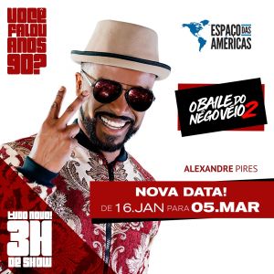 Alexandre Pires é sinônimo sempre de grandes shows e espetáculos. O cantor, desta vez, chega com tudo no Espaço das Américas para mais uma grande noite. Acontecerá nesse sábado, dia 05 de março o aclamado O Baile do Nêgo Véio 2. Uma experiência completamente remodelada, contando com novidades no cenário e também no repertório.