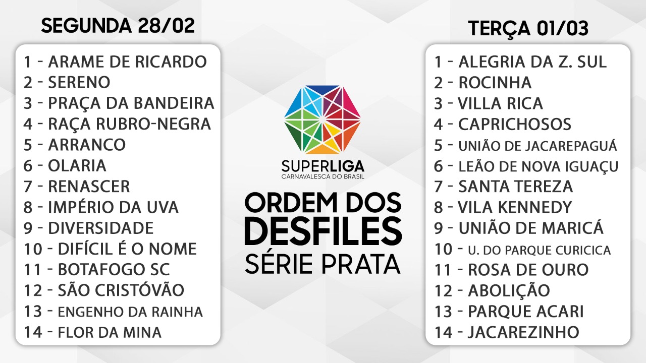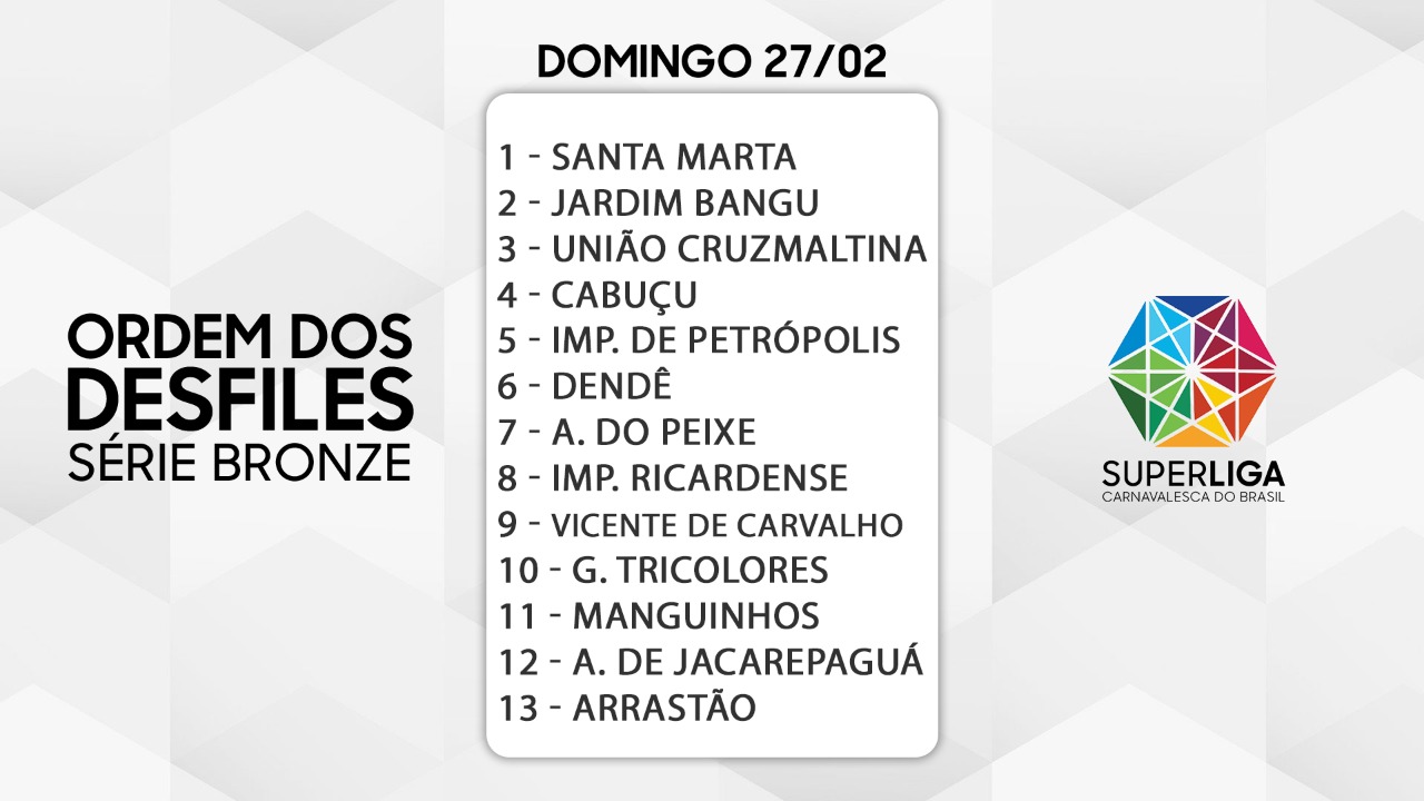 A Superliga Carnavalesca do Brasil definiu a ordem dos desfiles das suas agremiações para o carnaval de 2022. As escolas da Série Bronze e Série Prata conheceram a posição que desfilarão na Intendente Magalhães no próximo ano. O evento contou com a participação do Diretor de Operações da Riotur, Marcelo Bandeira, do Chefe de Gabinete do Presidente da Alerj, Rui Aguiar, do Diretor da Tv Alerj, Luciano Silva e do Presidente da Liga RJ, Wallace Palhares.
