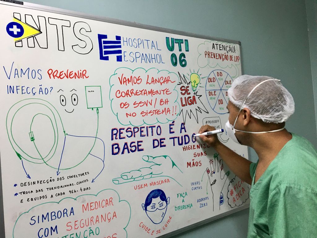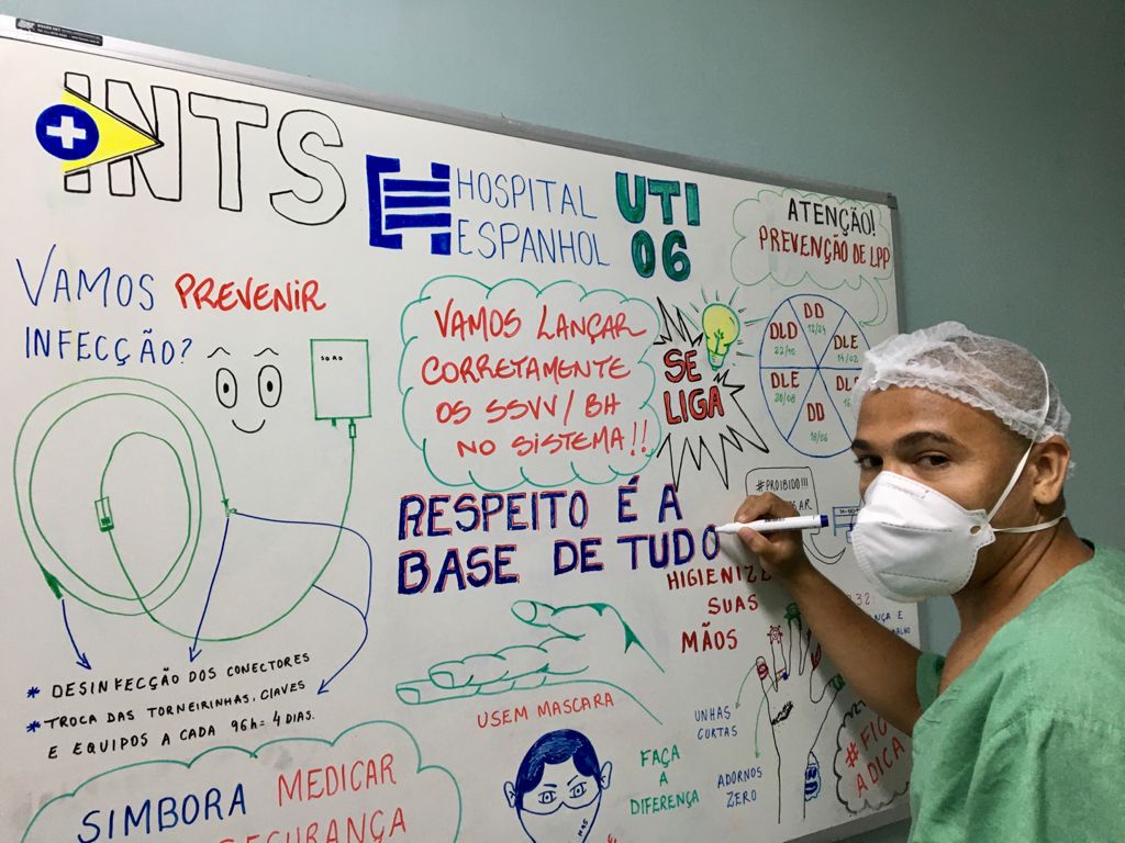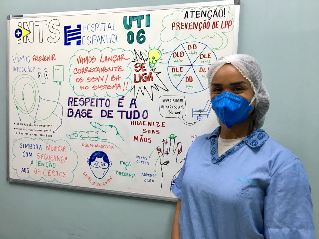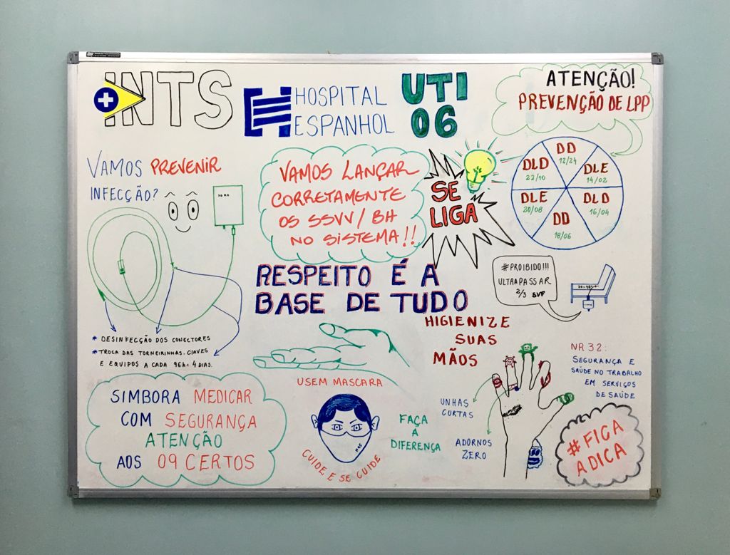 A equipe da UTI 6 do Hospital Espanhol implantou uma rotina diária e divertida para atualização das ações: desenhos didáticos e mensagens motivacionais, no quadro de avisos.