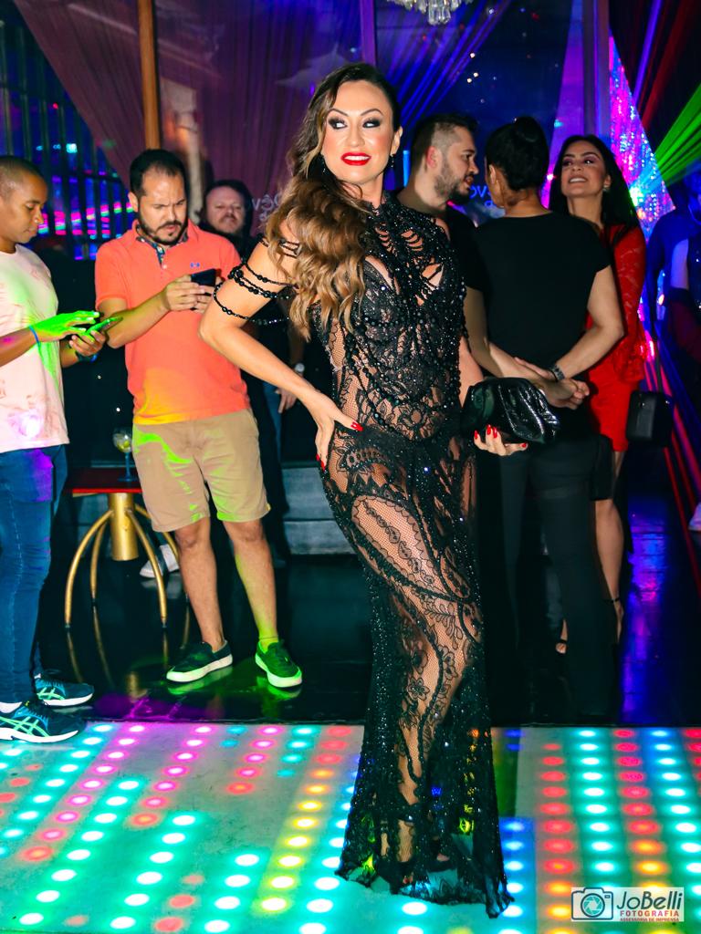 Para a ocasião, para receber os seus convidados a beldade optou por um look desenvolvido pelo Atelier Robytt Moon, composto por um vestido longo, todo em renda na cor preta e bordado com muitas pedrarias e cristais, o qual deixou em evidência sua impecável silhueta, enquanto divava durante a festa ao posar para os fotógrafos ao lado de seus amigos e convidados que fizeram questão de prestigiá-la.